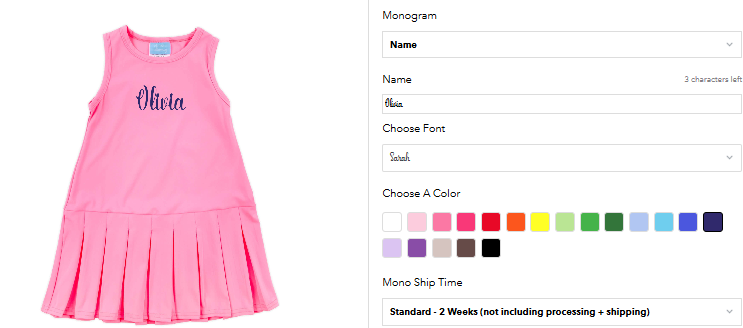 Once a monogram style is selected from the drop down list, additional fields are available to enter the personalization information and make selections for the font, thread color. As information is entered and selections are made, the preview image will update. The final step is selecting the Ship Time from the last drop down list.
